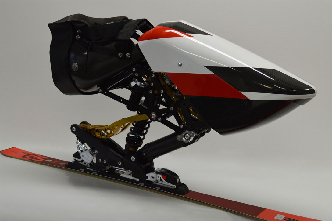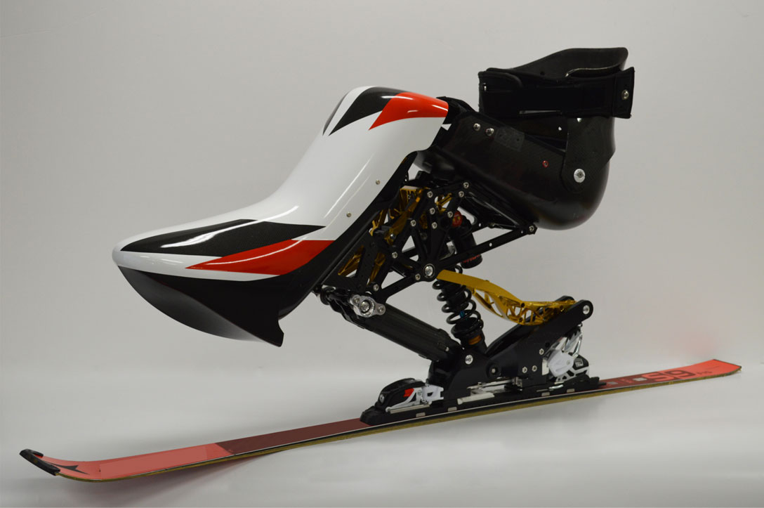 残疾人高山滑雪中使用的坐式滑雪板由四部分组成:两个悬臂和底座组成的、名为“滑雪座椅架”的基本框架,由金属弹簧和减震器组合而成的“悬架”,用来坐的“座椅”,以及用来提高空气动力学性能的“前围板”,其性能非常重要。