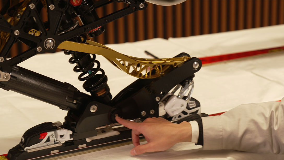 一柳:请看,座椅和滑雪板连接的部分叫做底座,这里我们将其分成了两半。由于拆分成了两个零件,滑雪板整体就拥有了很强的韧性,因而选手可以活用滑雪板的弯曲进行干净利落的转弯。