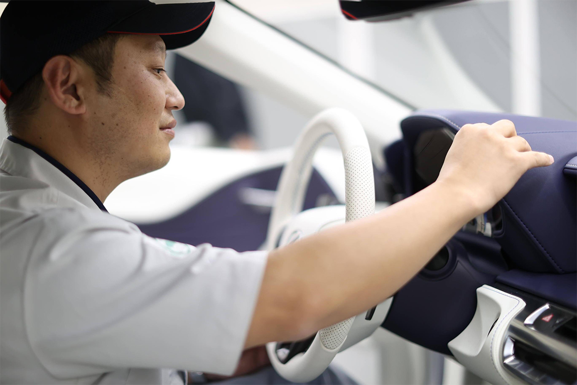 高档车的内饰大多为皮革。要制造这个皮革内饰,主要就是在树脂上贴上皮革材料。在量产车的阶段,这个作业有一部分是用机器完成的,但在试制阶段全部都得手工完成,而且形状越复杂,作业难度就会越高。