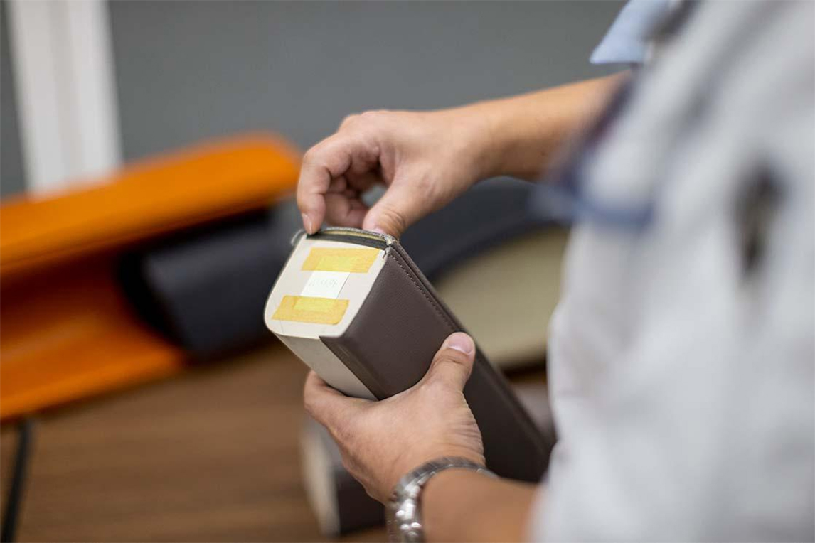 在决定使用多少海绵等缓冲物填充入皮革材料下面时,山下也活用了know-how