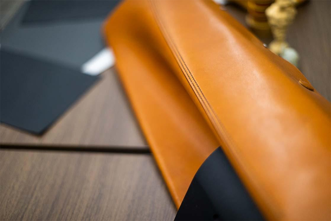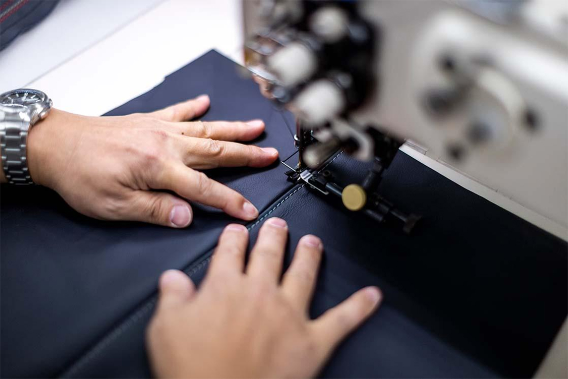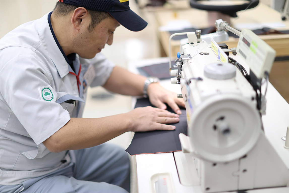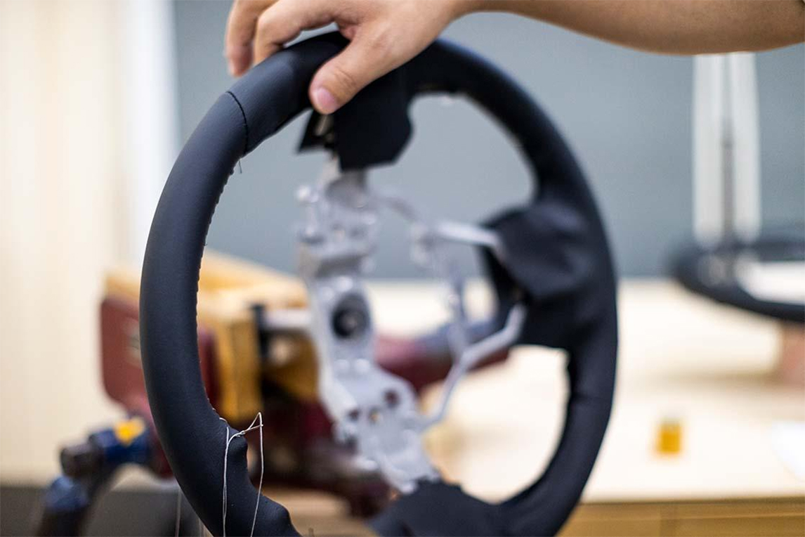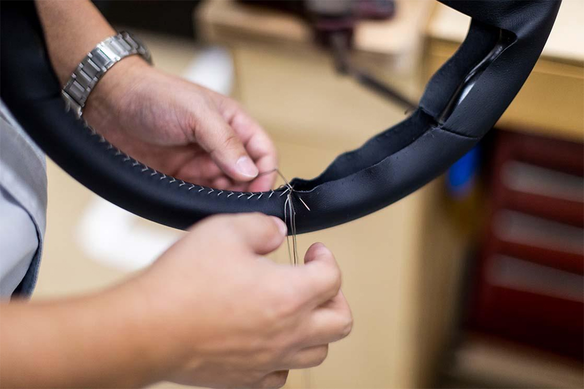 山下一边演示如何在方向盘零件上包裹上选好的合成皮革并手工缝制,一边回忆起了过往的经历。可以看到,山下手上的动作无比娴熟,这让他看起来就像一名经验丰富的皮革工匠。他保持针脚的宽度和长度均等的同时准确地将两侧缝到了一起。