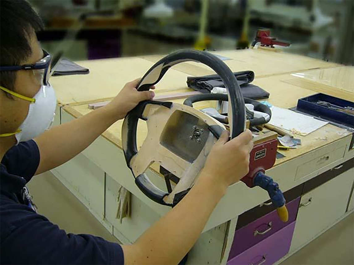 绕过模型向里看去,可以发现那里摆放着用来进行缝制作业的工业缝纫机以及工作台,那便是山下工作的地方。首先,山下为我们演示了皮质方向盘的皮革包裹作业。对原材料及技能都有所追求的山下,将自身在工作中培养出来的独家思路和know-how技术都融入到了制作当中。