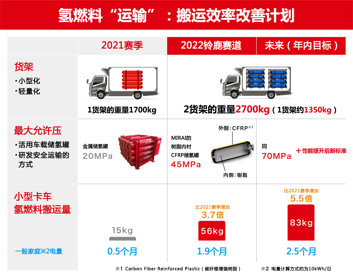 而且,从日本爱知县的丰田市到铃鹿赛场往返路程约200km,为运送15kg重的氢燃料,小型卡车就要耗费7kg氢燃料,可以说效率十分低下。