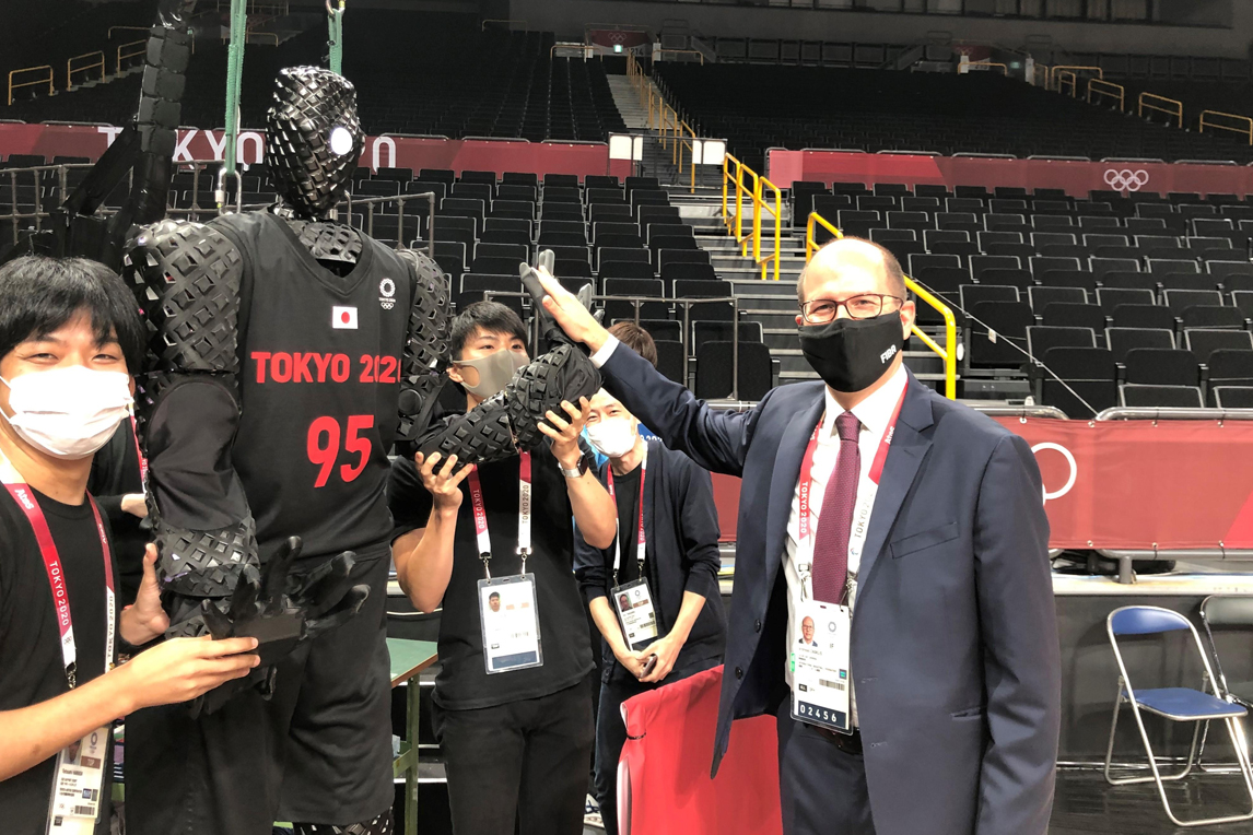 上图为CUE5在2020年东京奥运会上表演时,FIBA秘书长安德里亚·扎格里斯(Andreas Zagklis)赶到赛场为其加油的景象。