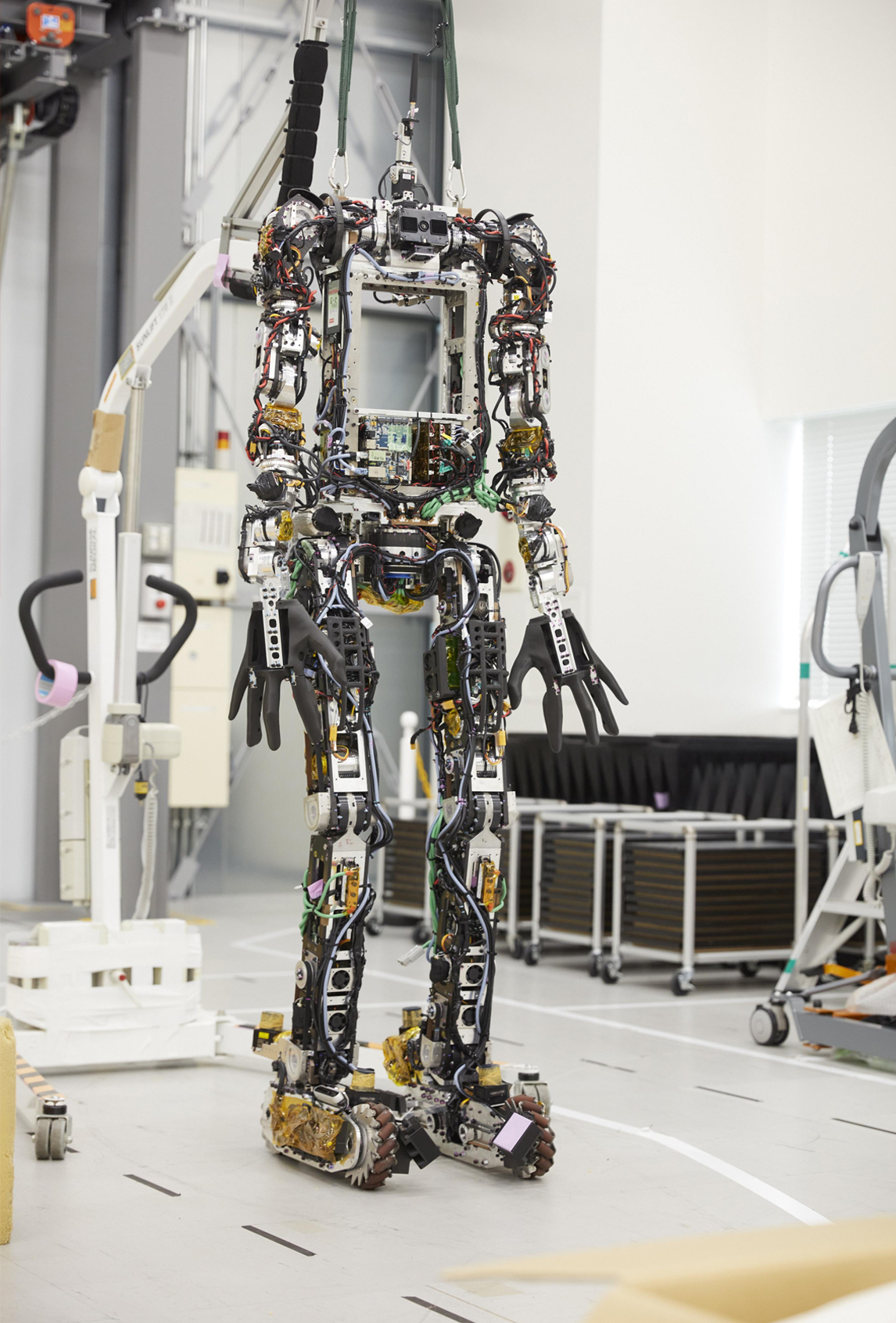上图为脱下外面那层黑色外套的CUE5。可以看到它的电池设置在胸前。它拥有像人一样的关节部位,因此可活动范围很大,同时可以依靠转动小型轮胎来进行移动