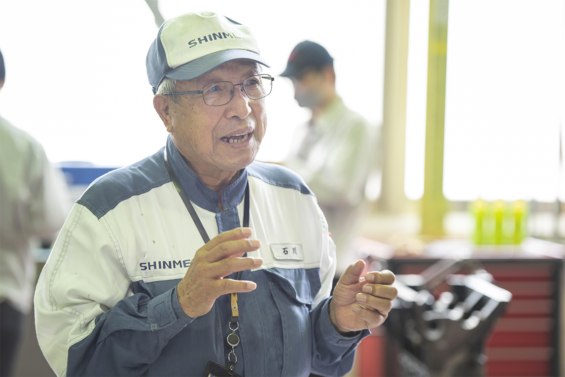 上图为指导发动机修复翻新工作的新明工业顾问石川实。