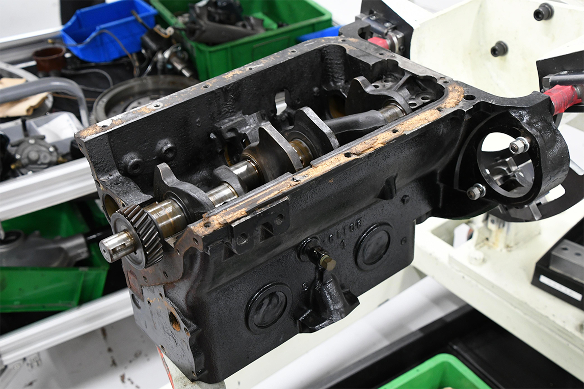 修复翻新工作首先从拆卸分解被保管的发动机开始。卸下螺栓、油封圈等零件,彻底分解发动机。然后认真检查每个零件,确认其状态,考虑后续如何修复再利用。