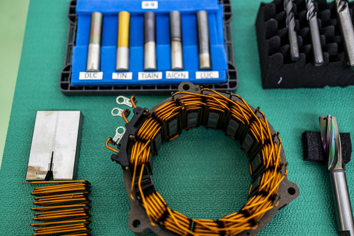 上图中央位置的物品是混合动力车的电机线圈。左侧的工具是用来剥除线圈外皮的专用剥削器。这种工具由集磨室精心设计的磨削方法制造而成,是一种改良再生后的特殊工具