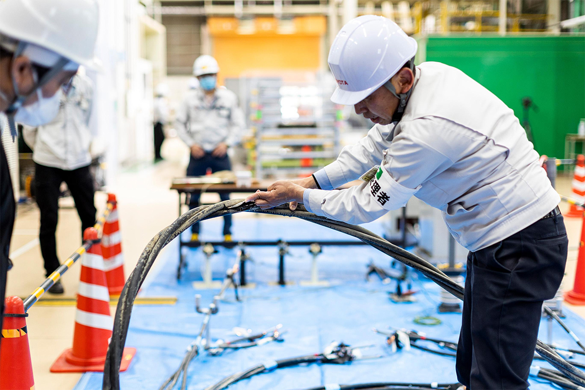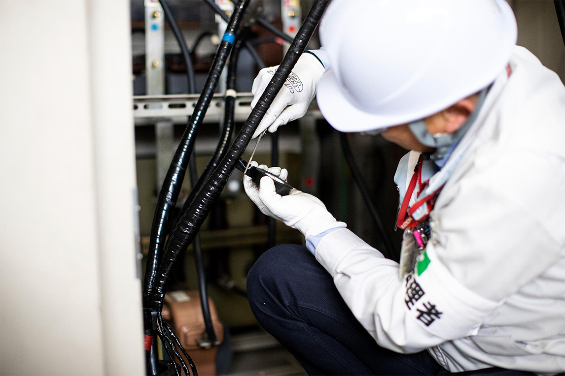 采访时,彦田与和自己同样考取了各种技能资格、国家职业资格证书的部下伊藤弘树,一起为我们展示了检查与维修高压电缆的技术。