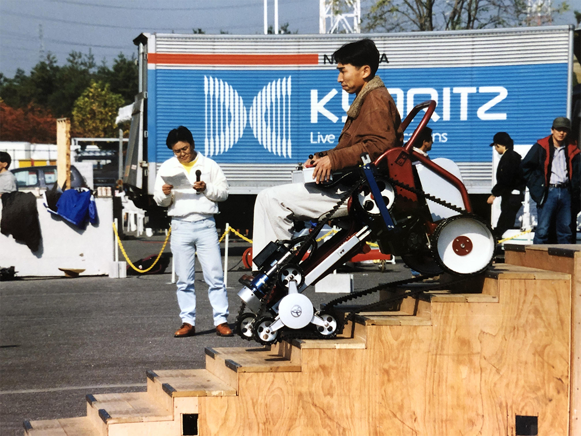 上图为与朋友们一起制作“能够爬楼梯的轮椅”年轻时期的彦田。该作品还在公司内部的“创意奥运会”获得了奖项。