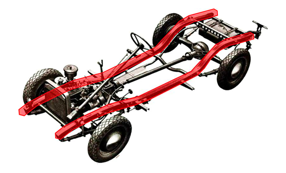 其中最大的主要零件是梯型车架,因为外观像梯子,故而得名。它就好比“车辆的脊柱”,由2条纵向的主梁(即纵梁),结合许多横梁所构成。