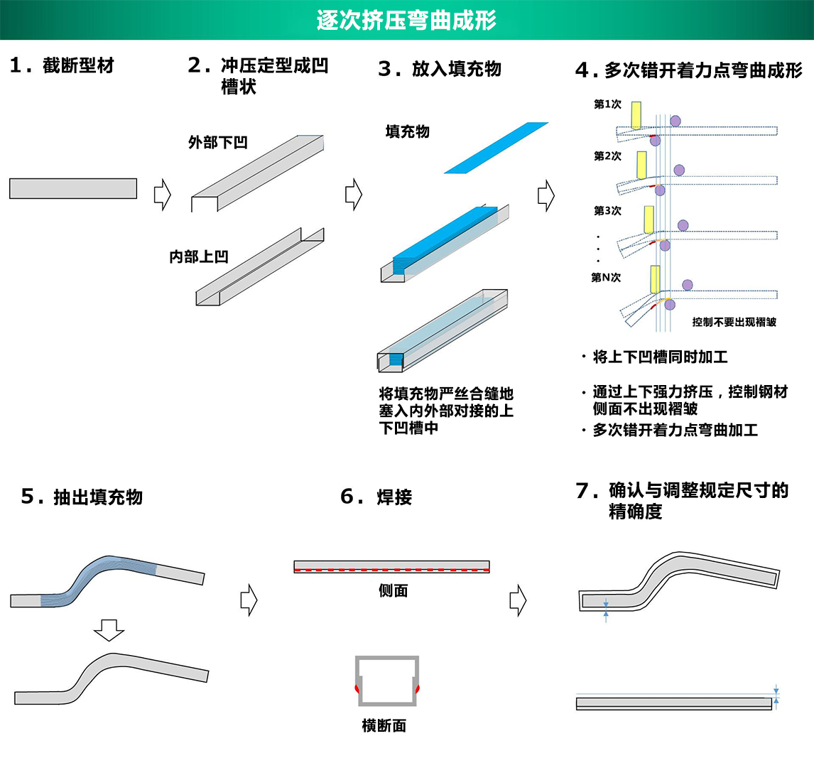 该加工法使用新研发的弯曲机,将管状金属用微弱的力量一点点挤压变形,并通过多次错开着力点的方式使型材成形。