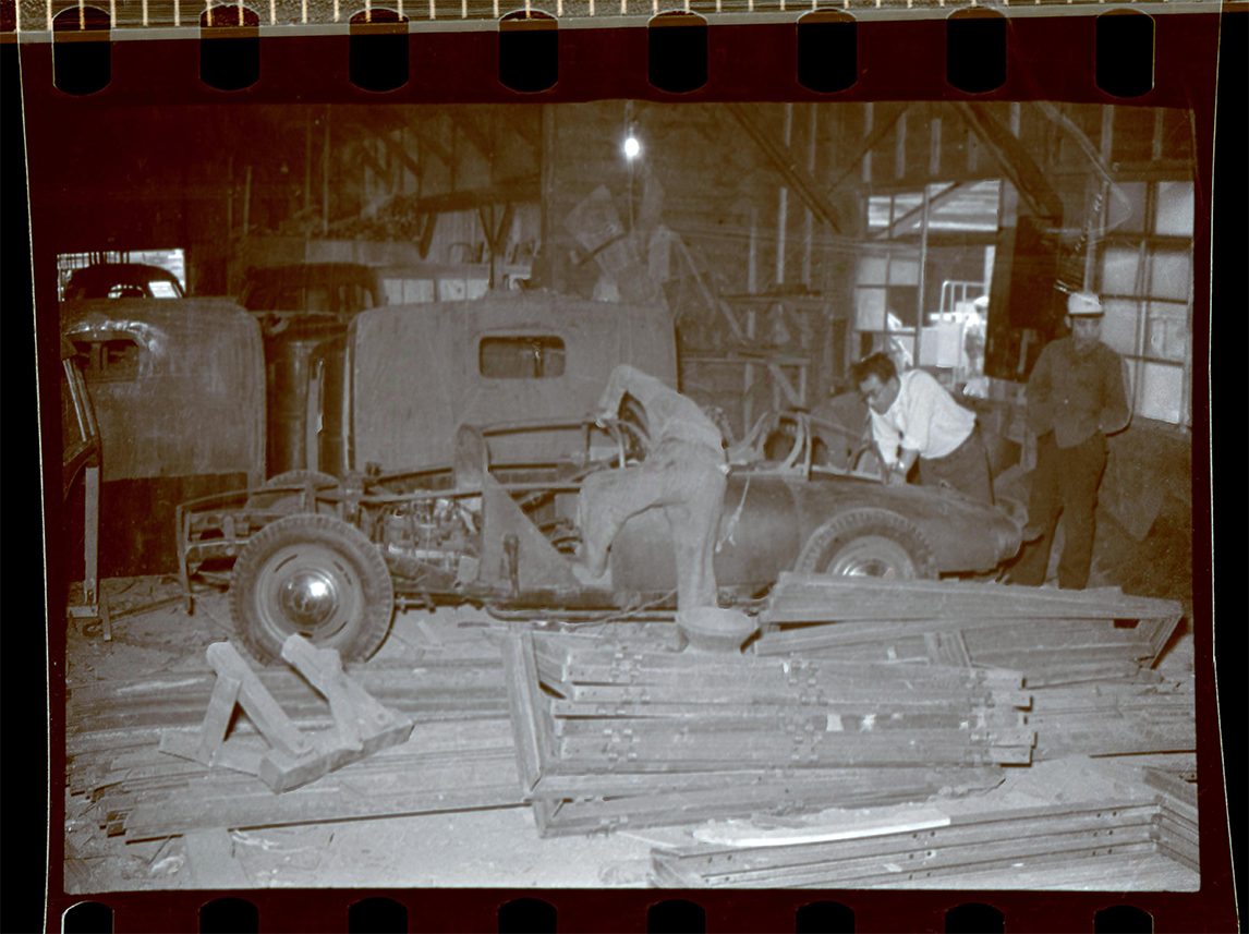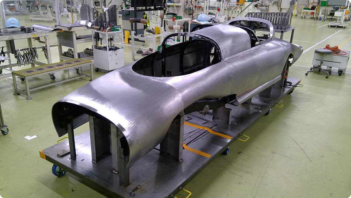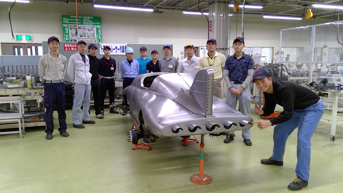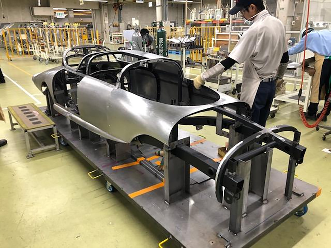 土谷和山田等年轻的员工们,“手工敲击钣金”的作业时间总计可达数千小时。他们在兼顾日常业务的同时,认真向山下学习手工敲击塑型钣金的技术,制作出一件件即将失传的旧车型大型结构,终于完成了车身板件的制作。