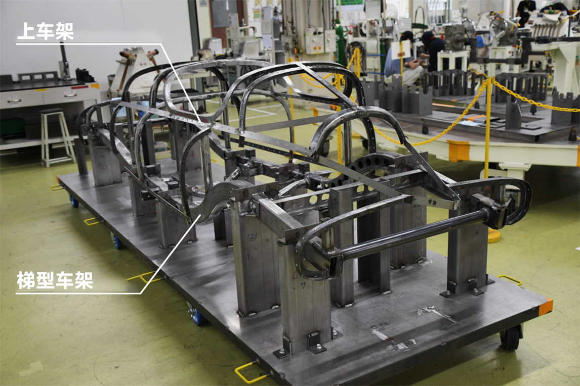 样品试验研发部的老手们亲手制作了上车架,然后由工程制造总务部的安井贤志负责将其焊接到梯型车架上。