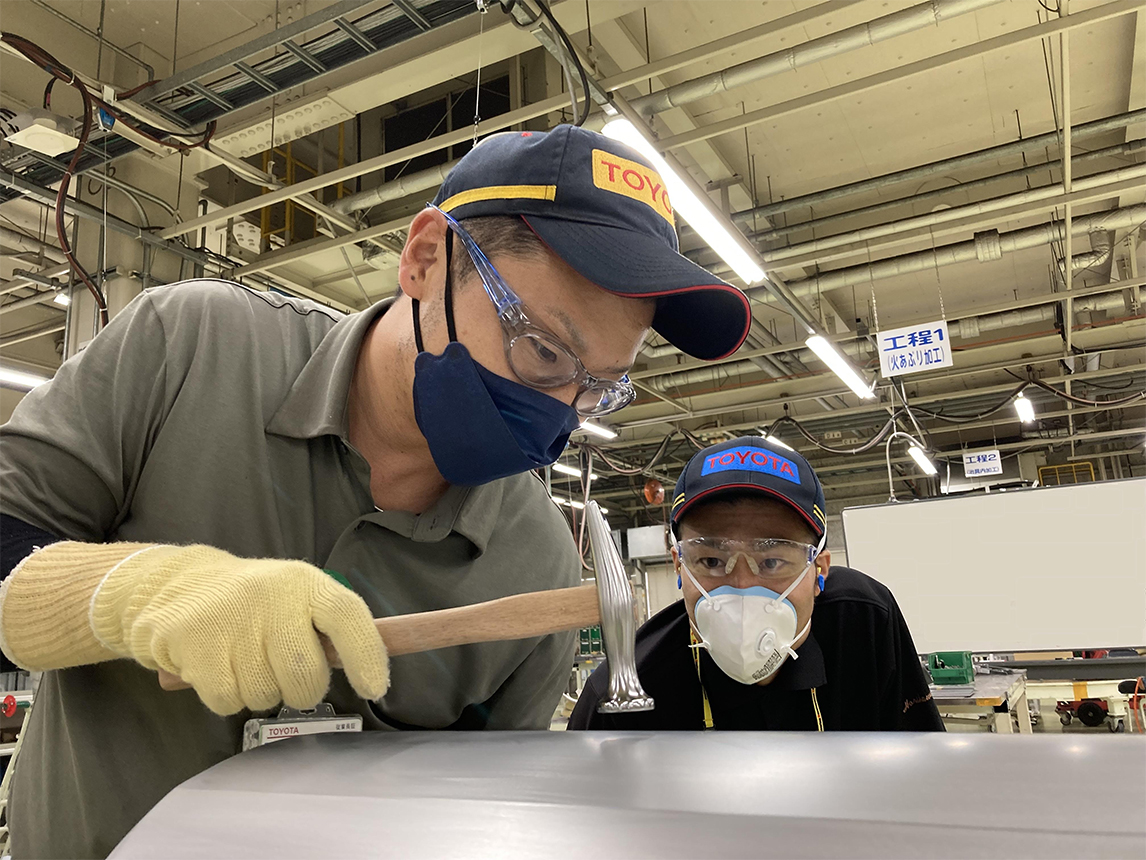 上图为正在用锤子矫正车身板件的土谷(左侧)和正在学习该技术的堀川(右侧)。