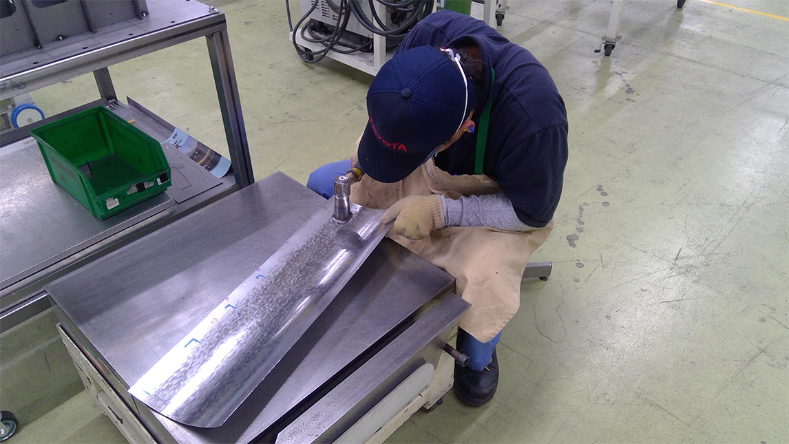 “手工敲击钣金”是钣金加工中的传统匠人技术,如今已很难见到了。该技术要通过纯手工敲击金属板对型材进行塑型,过程中不使用冲压机等工具。吉野曾在车展等场合上展示过用“手工敲击钣金”的方式制作概念车或试作车的大尺寸零件。如车身侧板等这些零件,每个都有数米长。