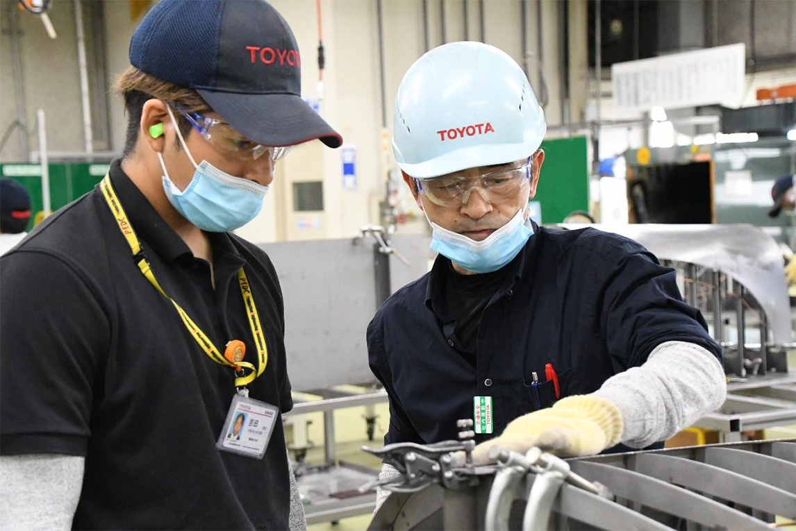 安井听取了自己所在部门“焊接专家”的建议,边学习技能边融会贯通,在作业中熟练地焊接上车架。隶属同部门的寺本治义则辅助安井完成工作,他会反复测量已制作完成的梯型车架,以及安井焊接在梯型车架上的上车架形状,并提供相应数据。