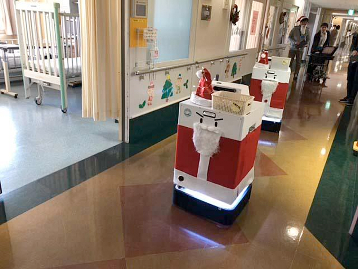 上图为圣诞节时身着圣诞服装的医流机器人,儿童住院楼的孩子们非常喜欢它。