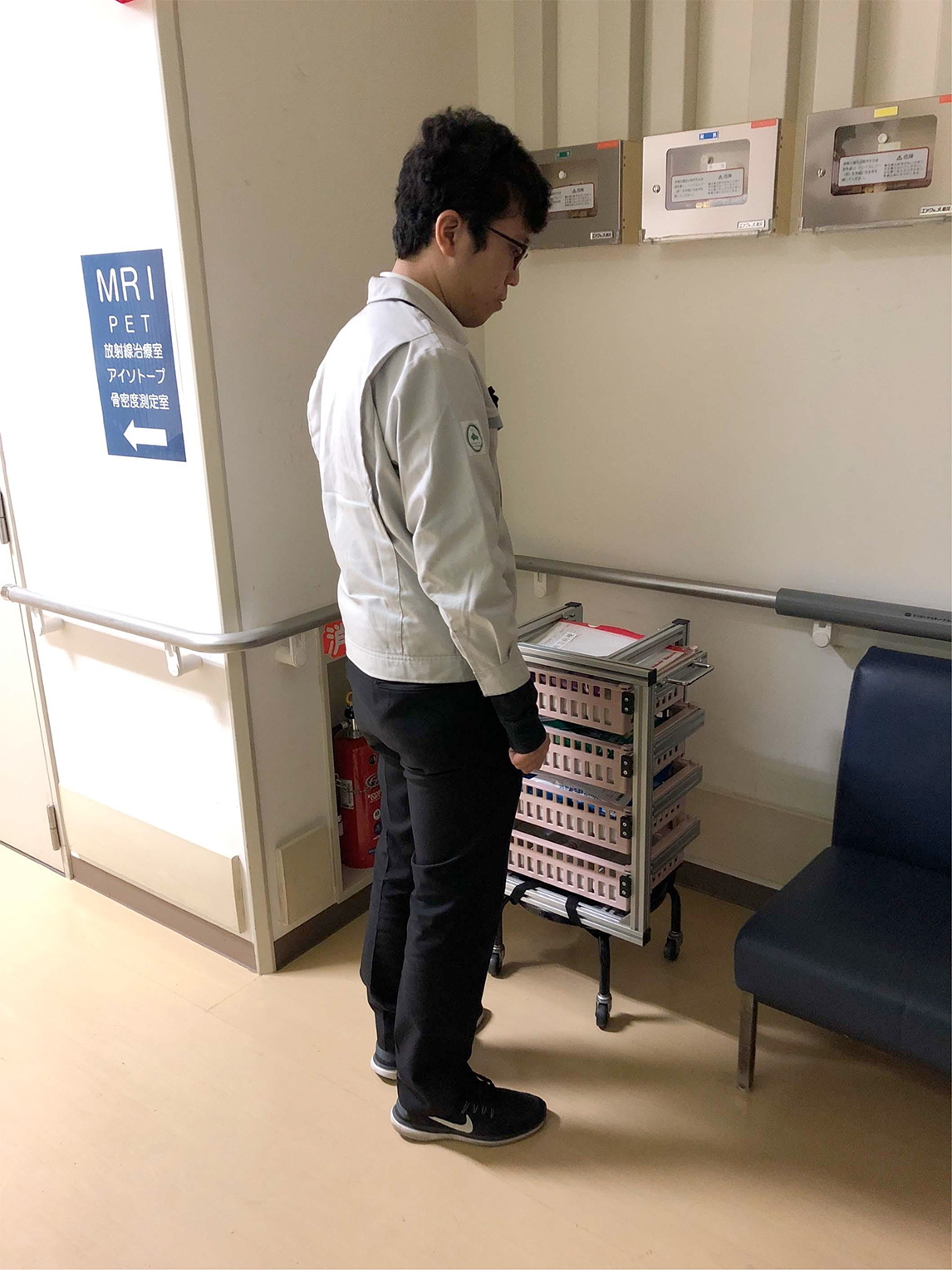 上图中的研发人员正在模拟自己是一台医流机器人,考虑待机时停在电梯间的哪里更合适,观察墙壁的形状会有怎样的影响。