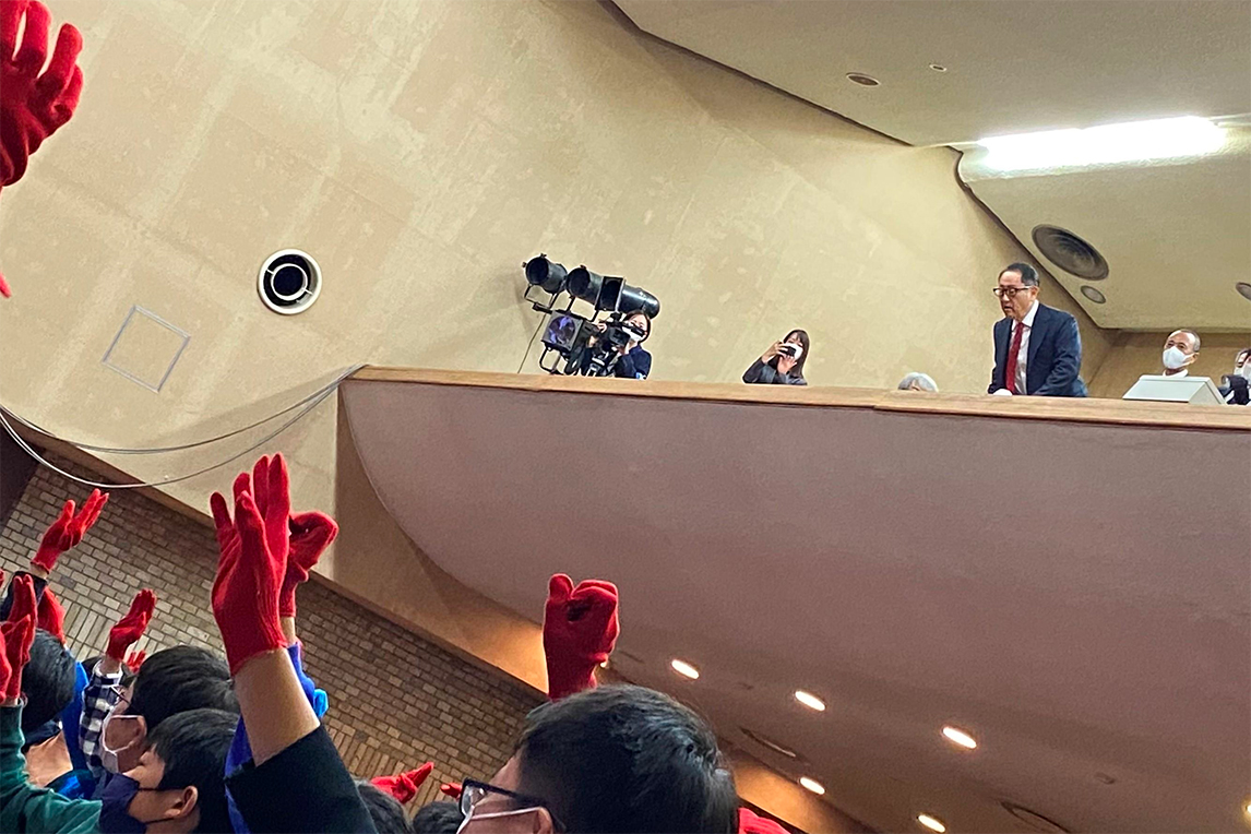 为了解中学生们对碳中和的理解程度,在二楼悄悄参加特别课堂的丰田社长竟然站了起来,兴致勃勃地看着下面的孩子们。
