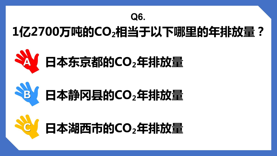 这道题的正确答案是A。另外,山本老师解说道,这相当于湖西市170年以上的CO₂排放量。听闻此话学生们大为震惊。关于如何进一步减少CO₂的排放,山本老师又开始为同学们介绍起世界各国的能源情况。