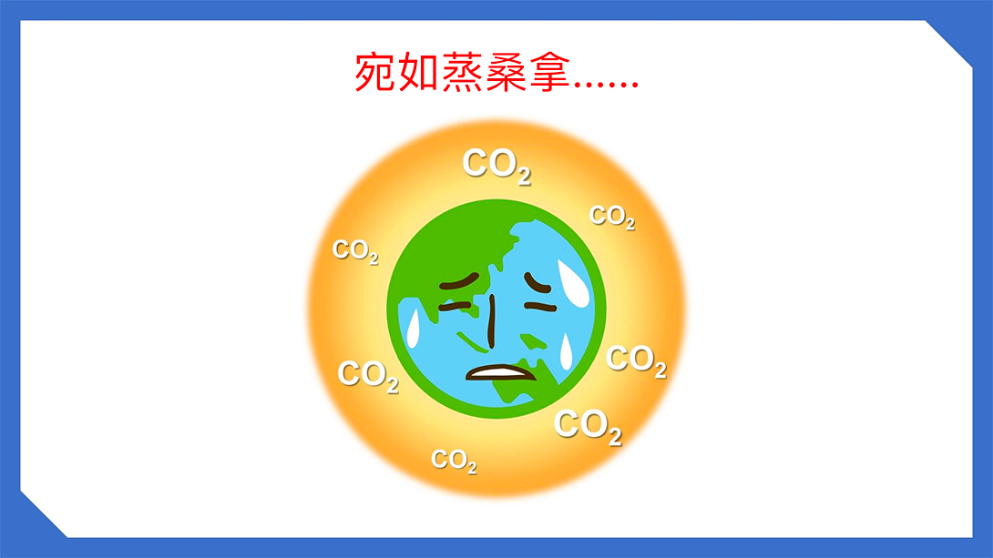 如果CO₂排放量过多,覆盖了地球周围的话,太阳的热量就散不出去,这一现象就是“全球气候变暖”,类似于地球处在一间桑拿房里。如果全球气候变暖程度加剧,就会出现各种问题。
