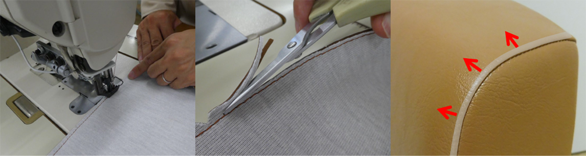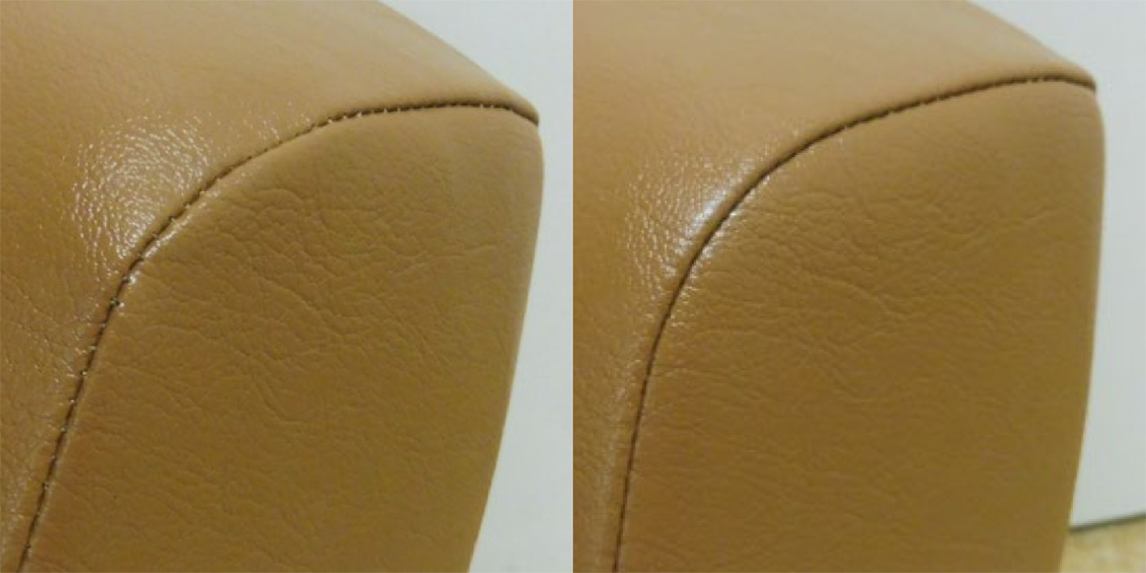 右侧是针迹和缝份均为3mm,将靠背侧面材料缝合到座椅靠背面上,以保证接缝在侧边的方式制作的成品效果。对比不难看出右侧更加漂亮整齐。