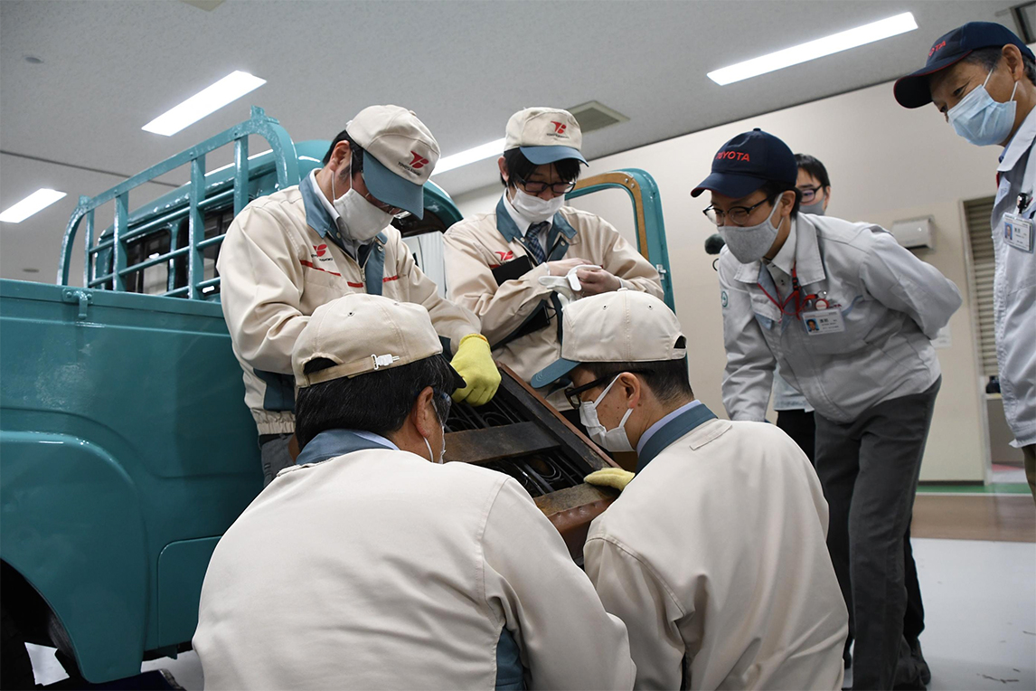 丰田纺织的员工们第一次来到位于丰田汽车总公司的TOYOPET RACER复原小组基地。他们立刻查看了从丰田博物馆借来的复原用“教科书”——TOYOPET SG型卡车的座椅。