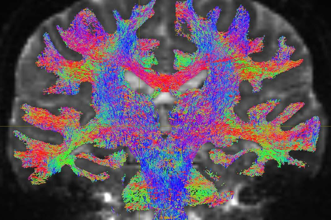 近年MRI的技术获得了长足的发展,现已实现了神经纤维束的追踪成像。下图为通过弥散张量成像(DTI)手法,描述的脑神经信号详细结构图。