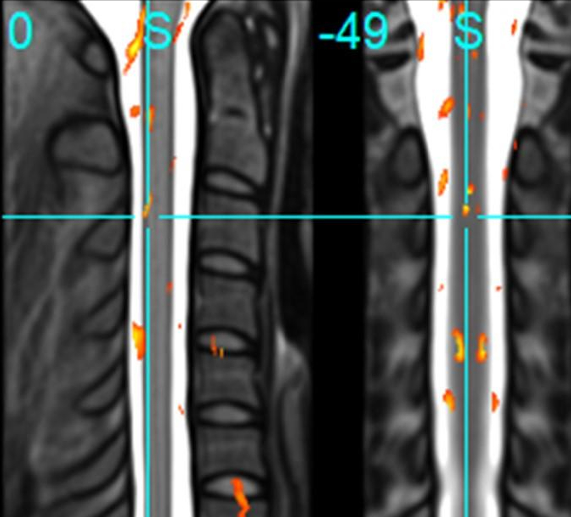 上图中橙色部分表示大脑与脊髓管神经信号活动量的差异之处。通过这种方式可以观测到人在运动时,不仅使用了大脑,还使用了脊髓。