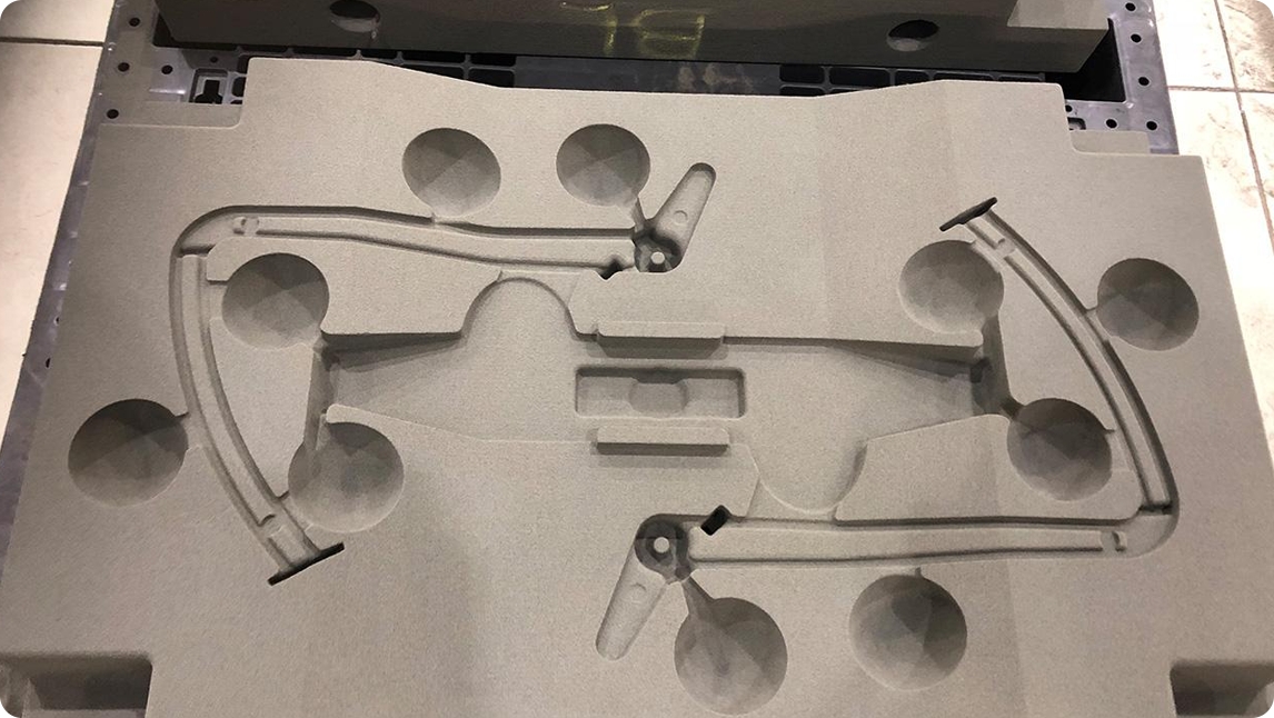 上图为使用3D打印技术制作的变速器壳体砂型。将上下两个砂型组合,向砂型内部空洞浇铸熔汤,待冷却后零件成形。