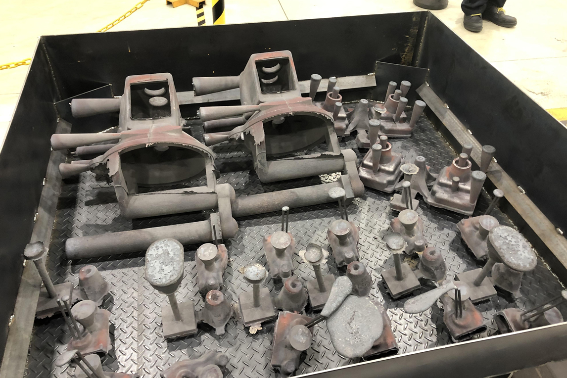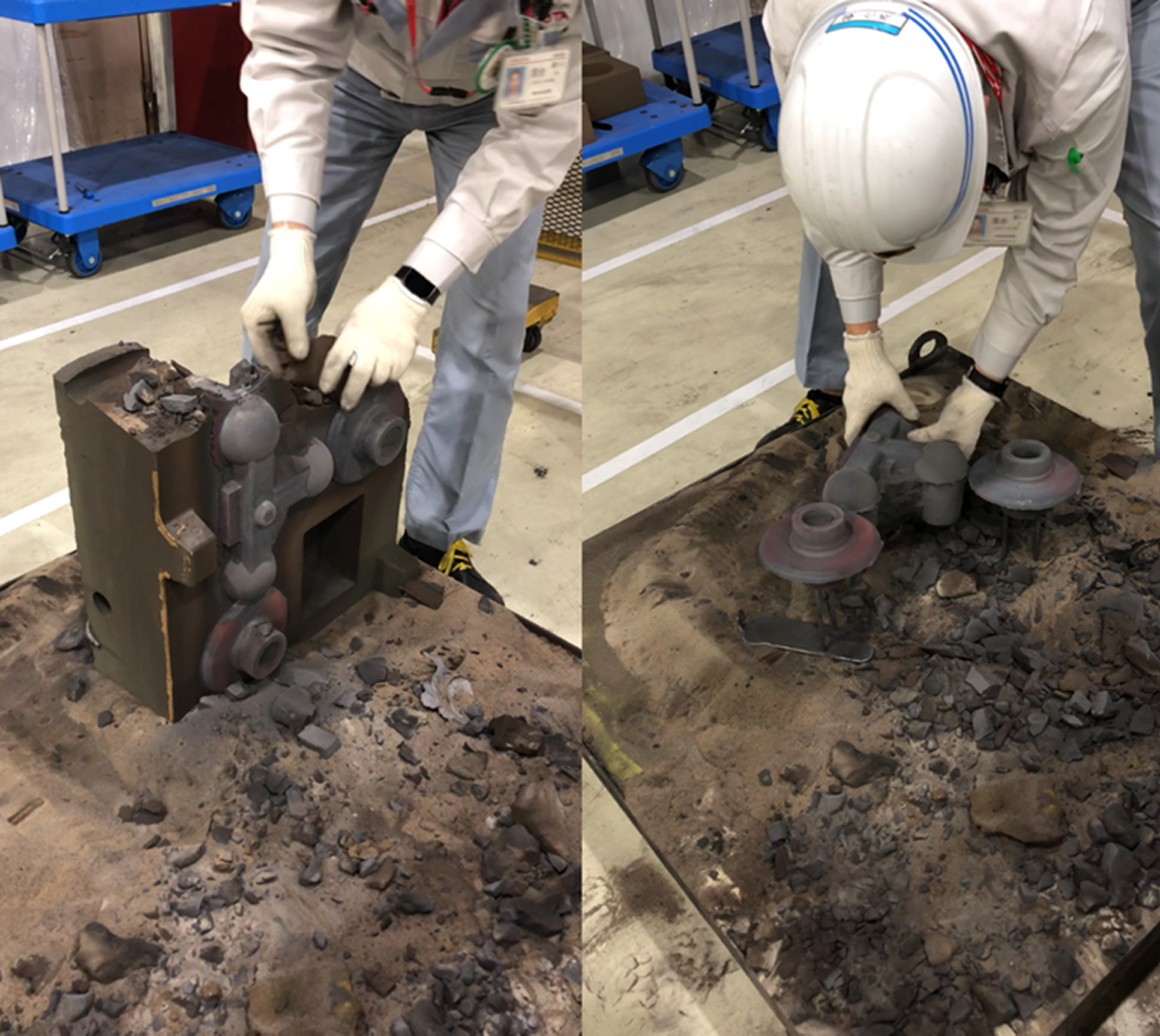 向砂型中浇铸溶液的工作,由研发制造中心铸造部的老师傅们负责。待零件冷却,将其从砂型中取出,进行精加工成形工序,与3D建模数据进行对比确认后,变速器壳体与踏板类的零件铸造工作终于完成。