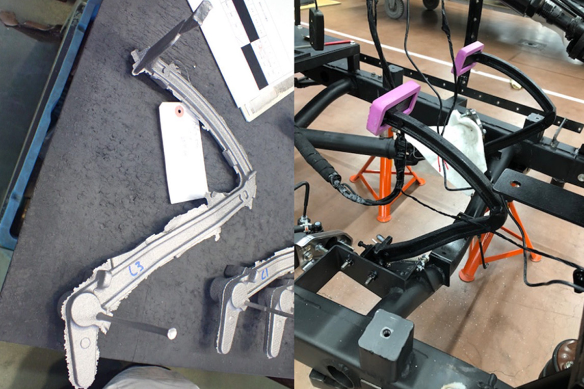 上图左侧为铸造制作的离合器与刹车踏板,右侧为将左侧零件精加工成形后,顺利安装到汽车底盘上的状态。