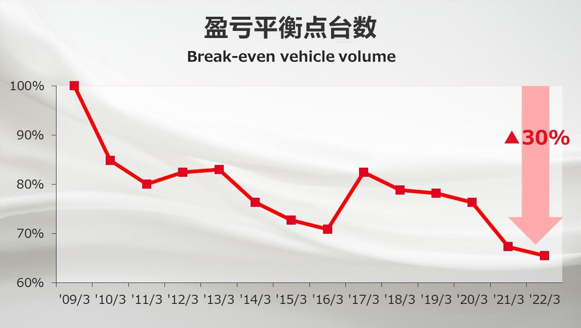 同时,我们致力于和各位供应商一起进行制造改革和体制强化,因此盈亏平衡点台数的情况比雷曼危机时期改善了30%以上。
