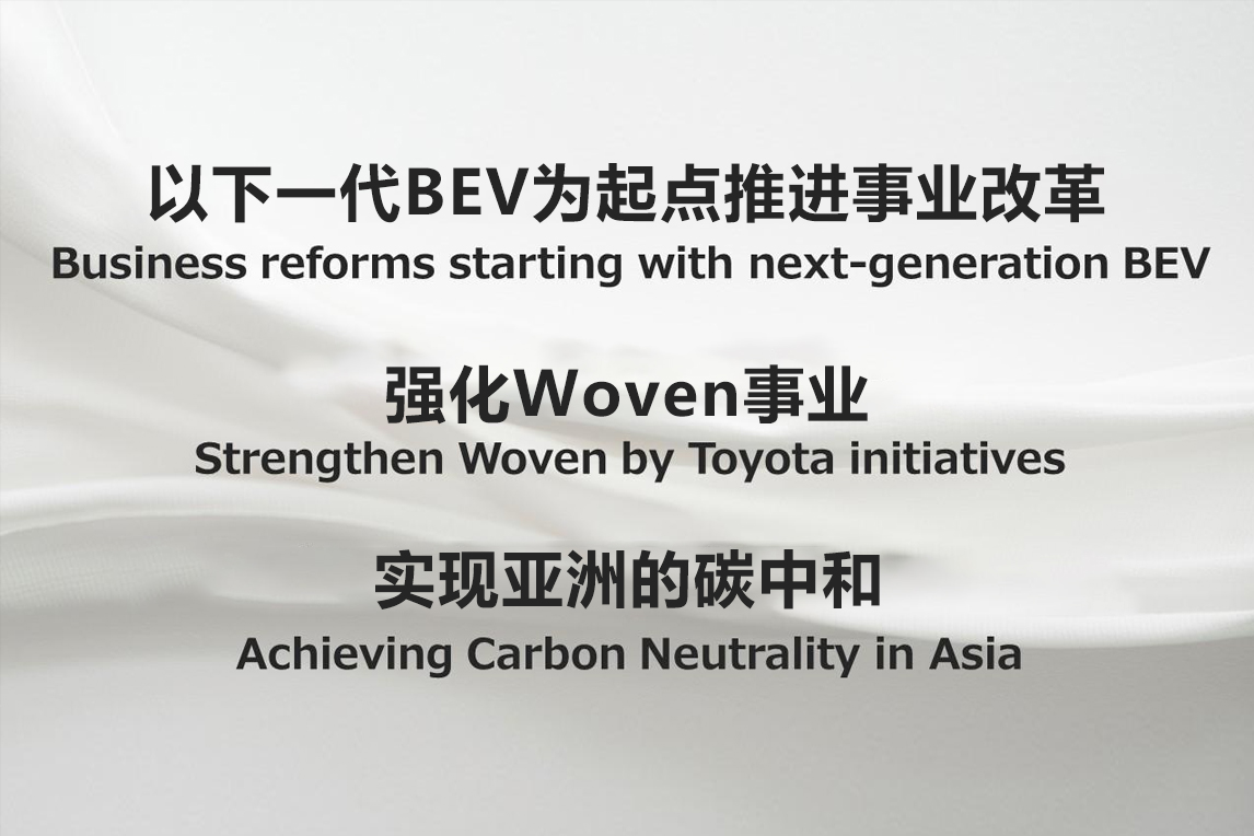 丰田接下来的重点工作包括“强化Woven事业”“实现亚洲的碳中和”“以下一代BEV为起点推进事业改革”,方针是以“量才录用”和“重‘能力’不重‘头衔’”的思维方式进行“团队经营”。
