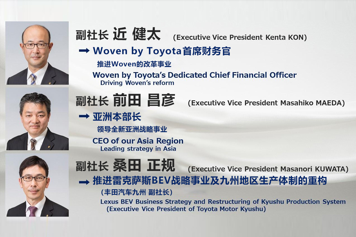 首先要介绍的是3位副社长,他们一直以来跟在高层身边,近距离学习经营之道。他们3人将践行丰田亲临一线的风格,在最前线指挥建设三大重点事业。