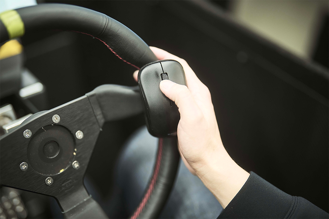 上图为通过驾驶模拟器模拟“驾驶时”的场景。驾驶席和副驾上的二人正一边驾驶一边玩黑白棋,这令人意外的实验究竟有何目的?