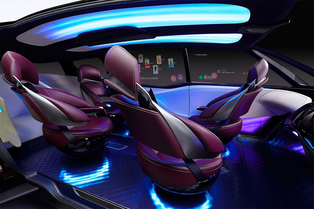 设计时我们一直思考,有没有属于“自动驾驶特有的体验价值”。特别是Fine-Comfort Ride的设计,我们在车顶与车内地板上覆盖了流光溢彩的灯光布景,营造出一个冥想空间,有助于用户坐在里面恢复调整自己。另外,我们还提出了有效利用侧窗,实现全新交流方式的概念。
