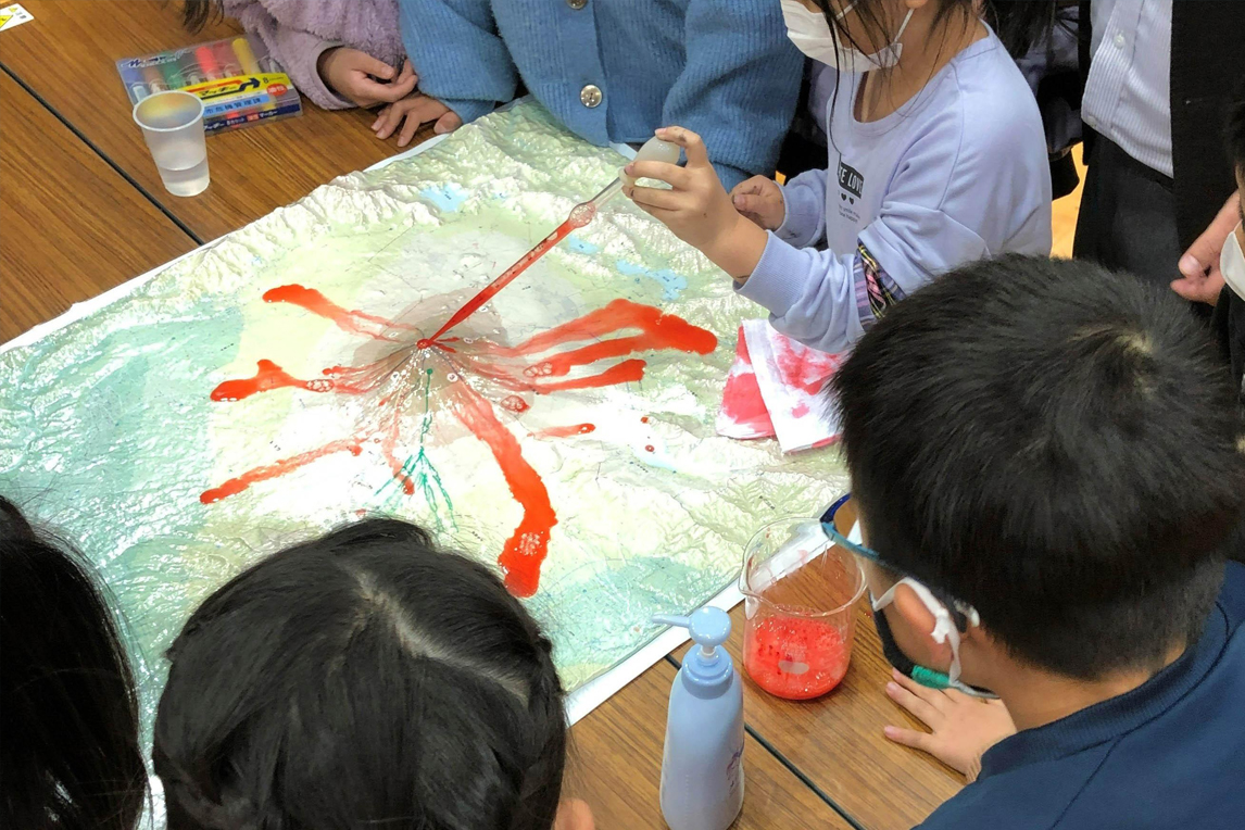 上图中小朋友们正在上防灾实验课,他们使用颜料模拟熔岩流动,观察“熔岩”流动区域与速度的不同。