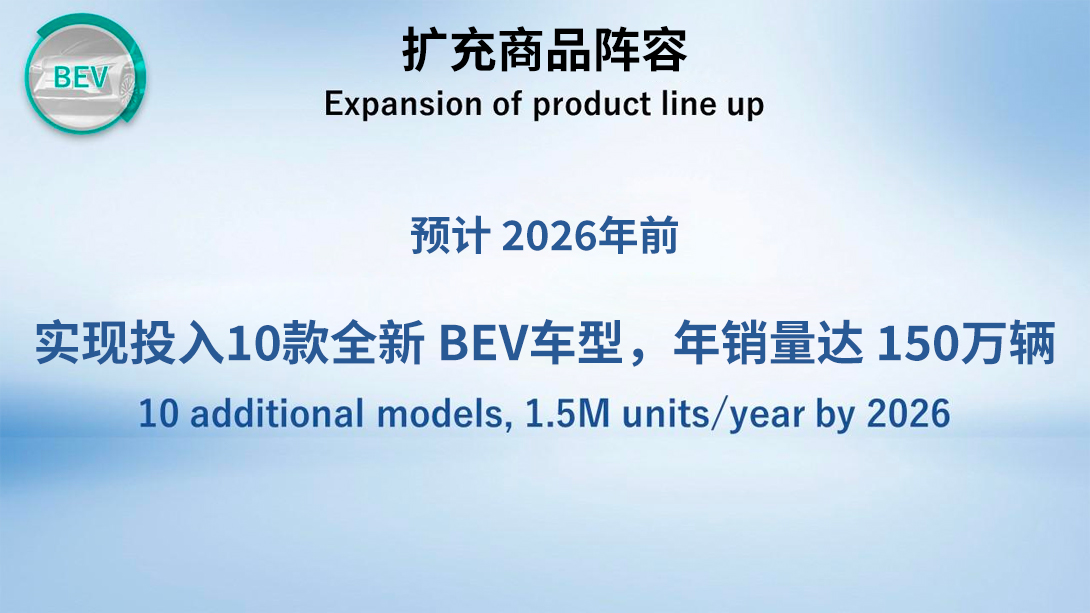 首先要投入BEV车型。我们将扩充基本盘产品线阵容,截至到2026年,预计投入10款全新车型,年销量达到150万辆。