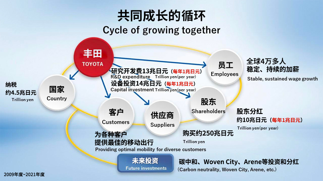 丰田的收益能力实现大幅提升。投资未来,与利益相关方共同进步,以及CO₂减排,这三大目标都得到了兼顾。