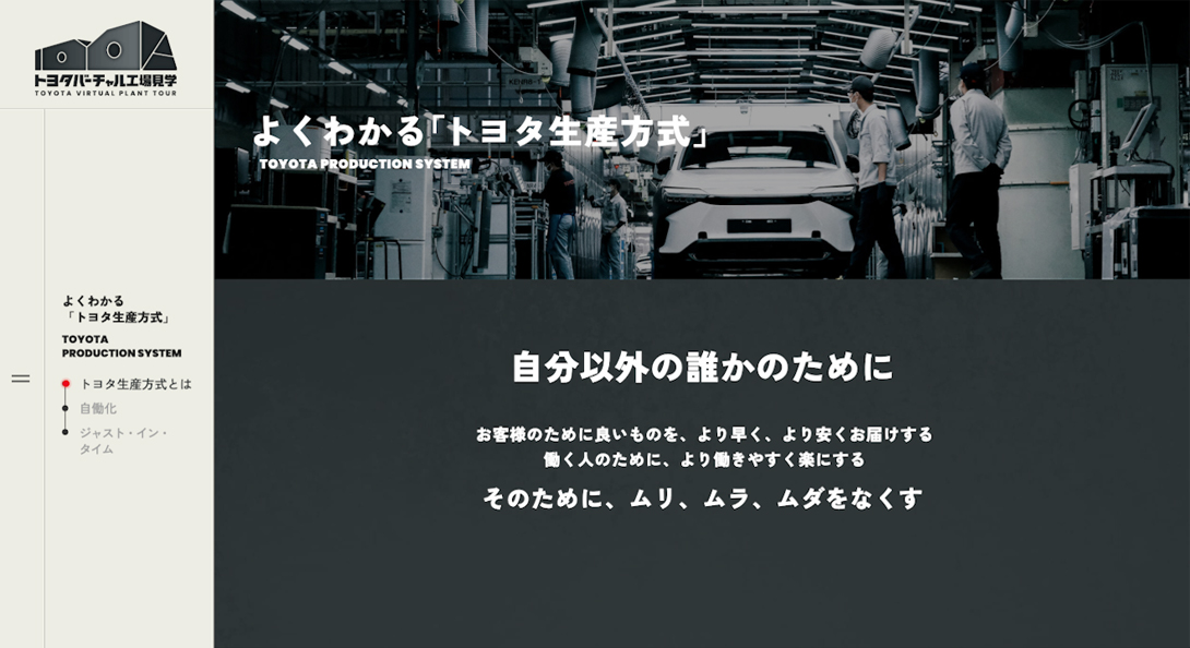 “虚拟工厂参观网站”是为继承和弘扬丰田喜一郎的思想,项目成员们寸步不让,精心打造而成。希望通过该网站,让更多的人了解丰田的造物,希望各位读者也务必去体验!