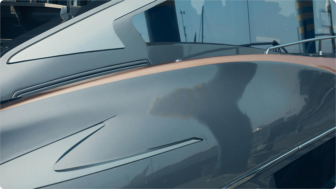 游艇侧面的银金色装饰条,其作用不仅是为了增加设计感,还能够有效抑制后方甲板兜风。活用了造车中的空气动力设计。