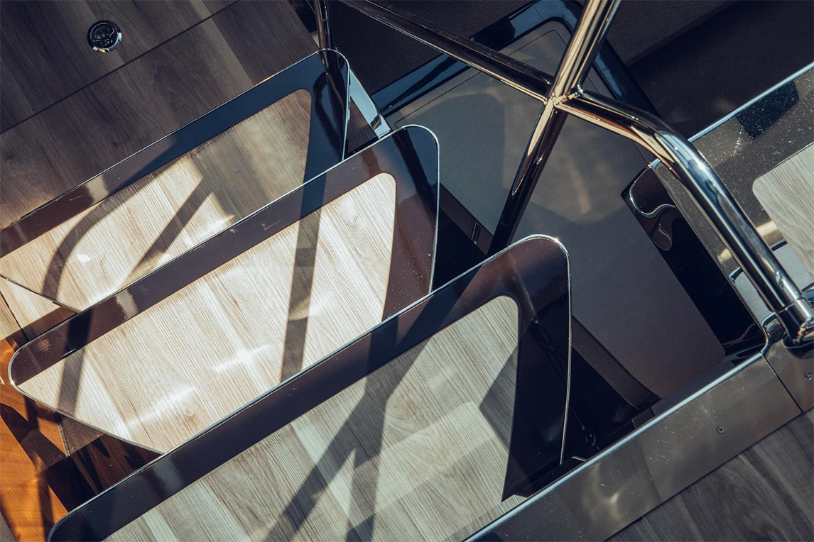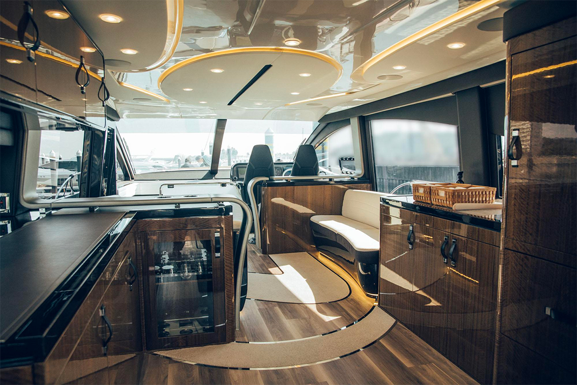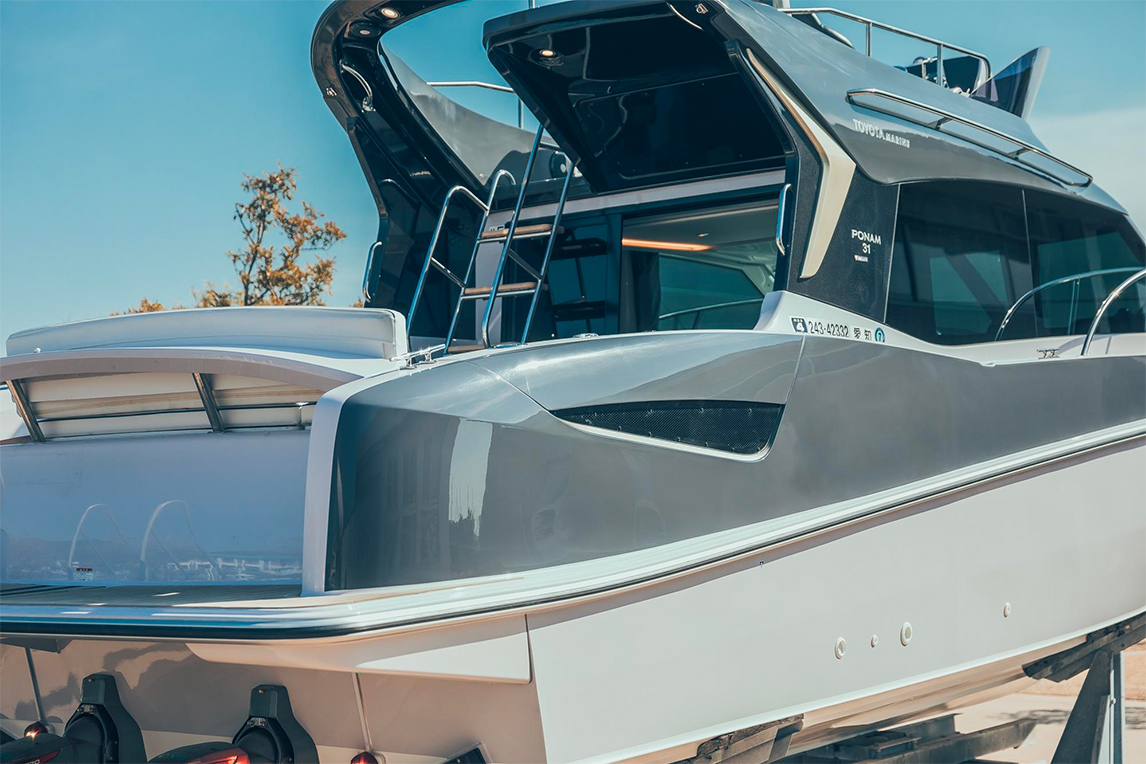 正因为游艇要从船尾乘船,所以尾部给人的第一印象非常重要。设计师们活用汽车外形设计技巧,兼顾了实用性与美观性。