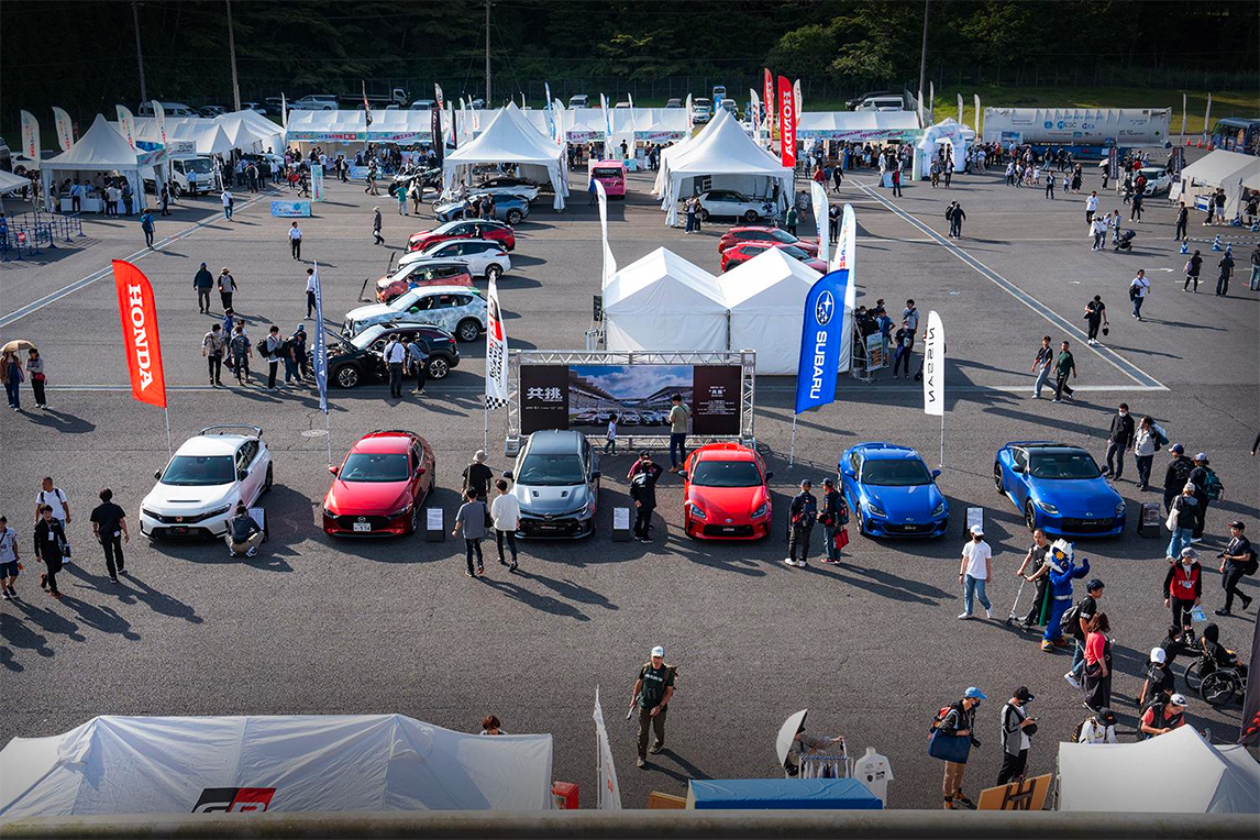 从左到右依次是本田CIVIC TYPE R、MAZDA3、丰田GR COROLLA、GR86、SUBARU BRZ、日产FAIRLADY Z。