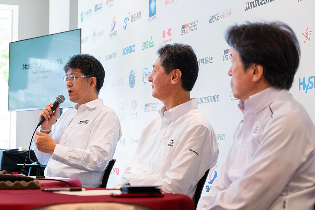 从左到右依次是丰田汽车社长佐藤恒治、马自达社长毛笼胜弘、WEC主办团体“ACO”主席皮埃尔·菲永、STO事务局长桑山。