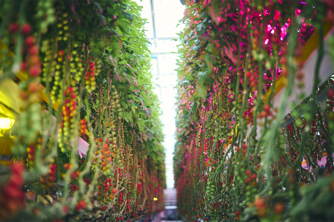 当我们进入到温室后,映入眼帘的景象让人吃惊不已。一串串小番茄在艳粉色灯光的照射下如瀑布般垂吊开来,整个空间给人一种如当代艺术作品般的视觉冲击。