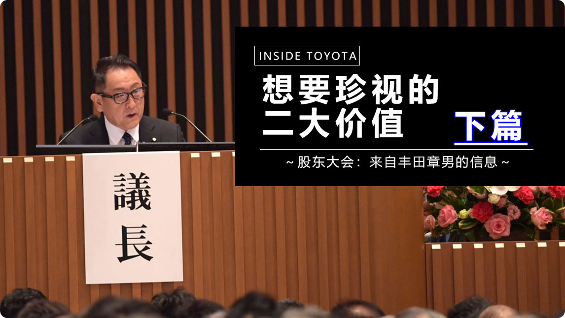 重拾丰田真正的价值观,不断提升丰田汽车和企业本身的价值。即便周围人都说“危机感太强了”,我也想要将这两大价值彻底地贯彻下去。还请各位股东今后也能一如既往地支持我们。