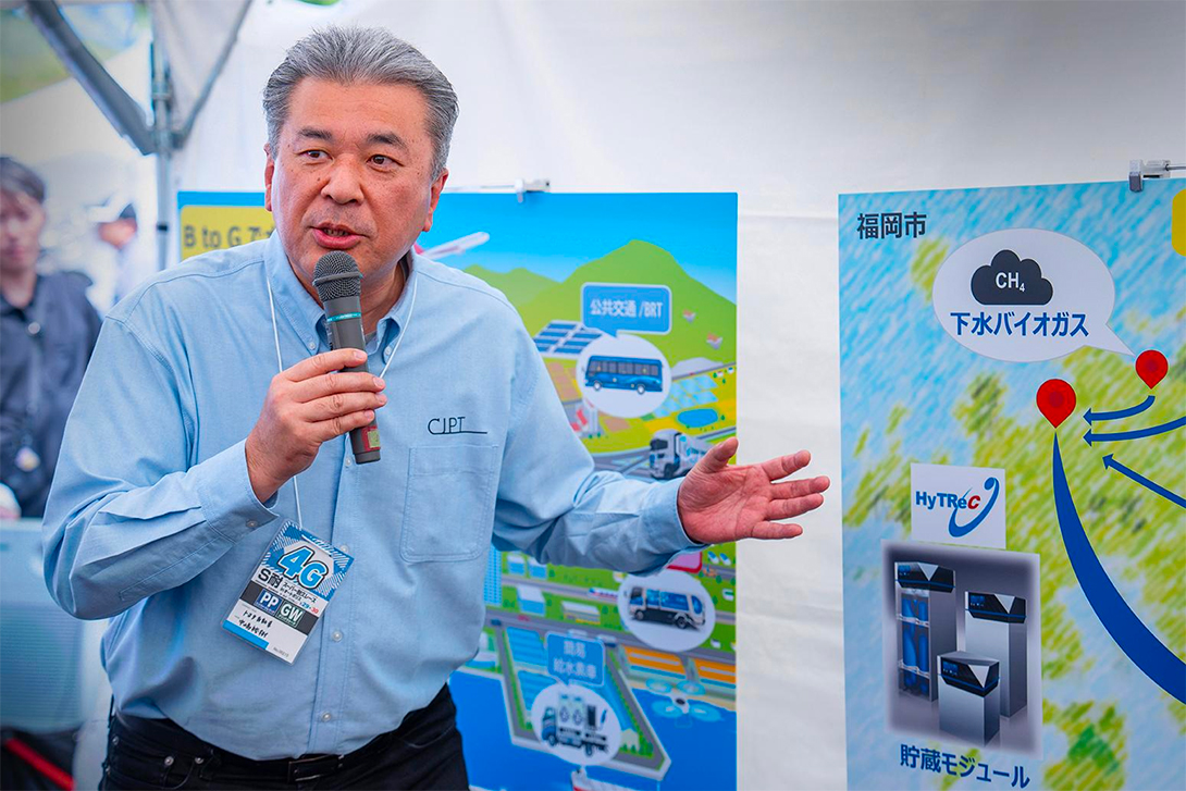 比赛期间,以九州为中心推进的氢能相关活动展览在AUTOPOLIS赛道举办。从燃料电池和氢能相关产品的研发工作到业务的运营,今年7月新成立的氢能Factory是一家能带来上述一条龙服务的机构,其总裁山形光正在圆桌会议上介绍了他们为推动氢能发展做出的努力。