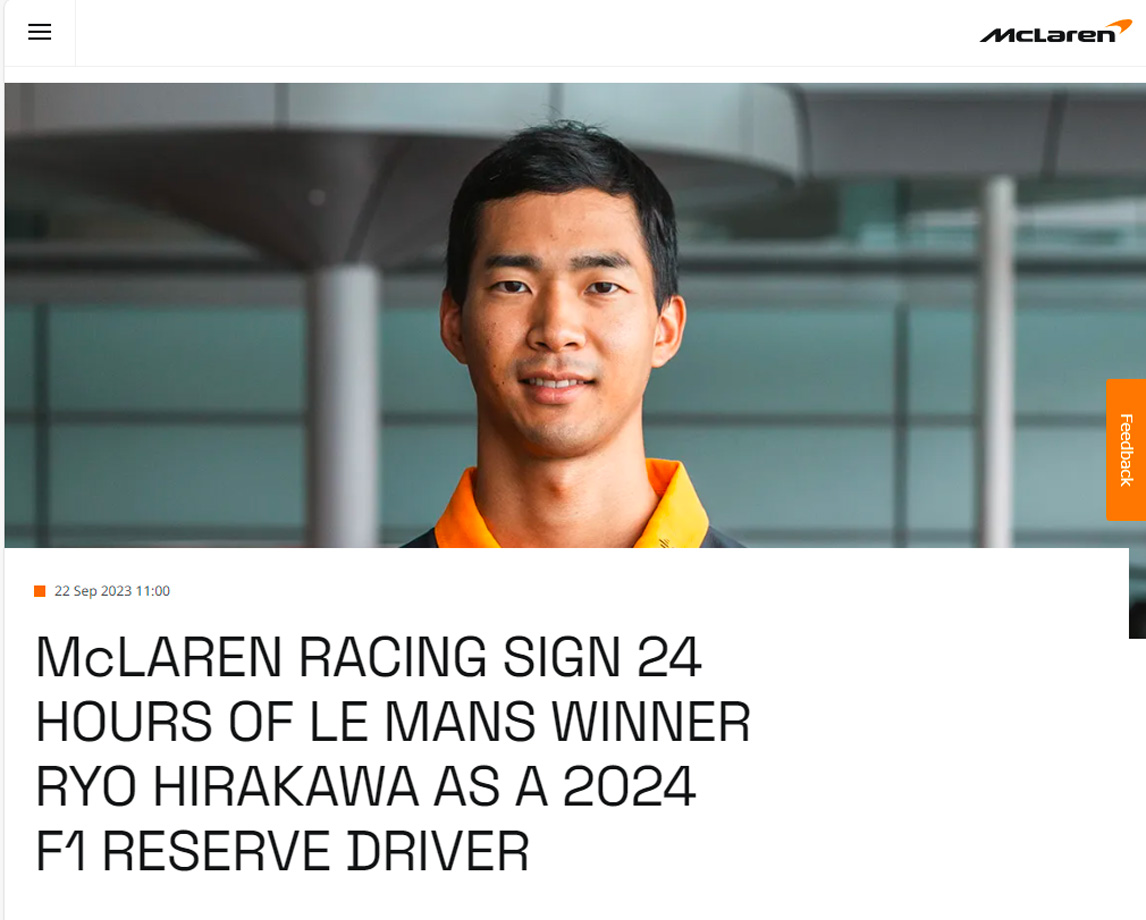 参加F1比赛的“迈凯伦一级方程式车队”在前一天发布了一份新闻稿,称去年摘得世界汽车耐力锦标赛(WEC)冠军、勒芒24小时耐力赛冠军的日本车手平川亮(29岁)将成为他们车队的替补车手*。